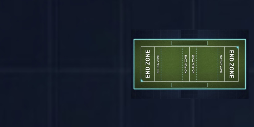 Within 5 yards of the middle line and 5 yards of each end zone, teams must pass — running with the ball is illegal.